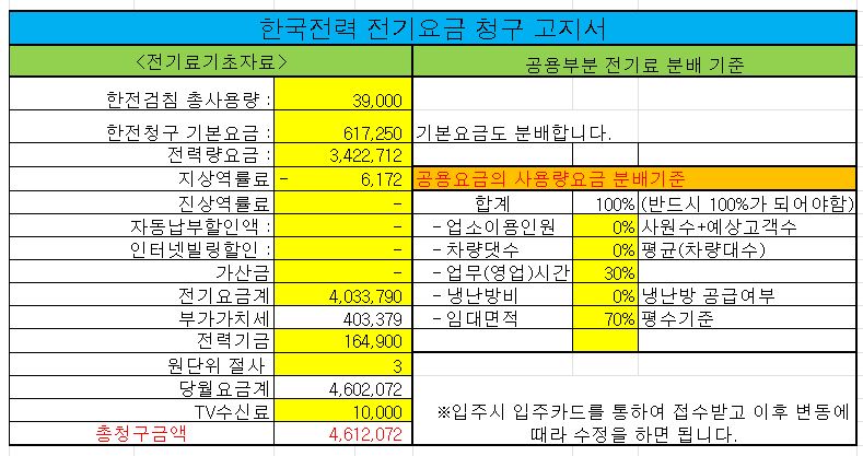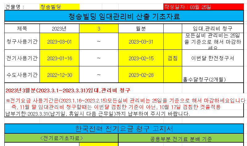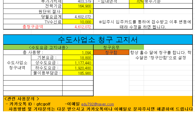 10여 년간 강남에서 연면적 1000평(8층) 건물을 운영 관리하면서, 이 엑셀을 사용하여 왔습니다. 임차인 관리 및 임대료 청구, 관리비 청구, 전기료 분배, 수도요금 분배 등 업무를 수행하였으며, 건물을 운영하면서 건물주의 다양한 보조 업무를 지원했습니다.