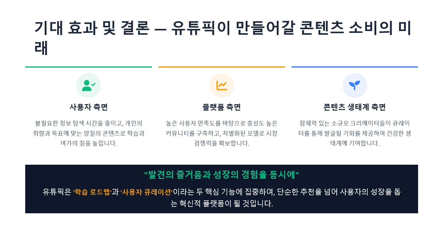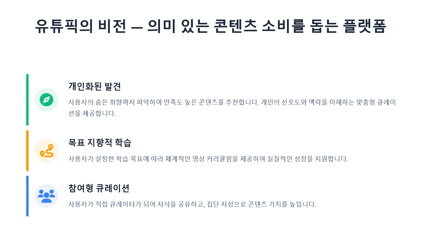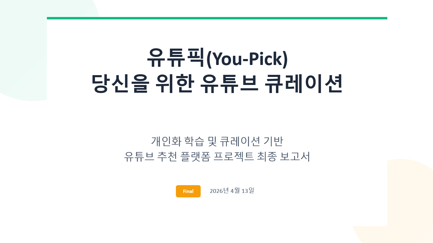 유튜픽(You-Pick)은 방대한 유튜브 콘텐츠 속에서 사용자가 원하는 영상과 학습 콘텐츠를 빠르고 정확하게 찾을 수 있도록 돕는 개인화 큐레이션 기반 추천 플랫폼입니다.
